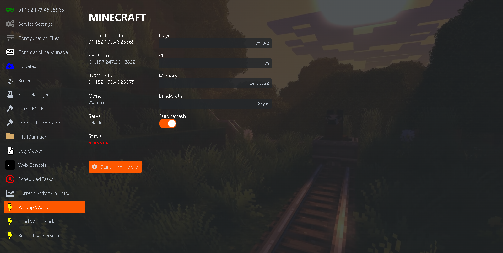 Use the one‑click Backup World tool to save a snapshot of your server. This is the safest way to protect your world before installing plugins/mods or making big changes.